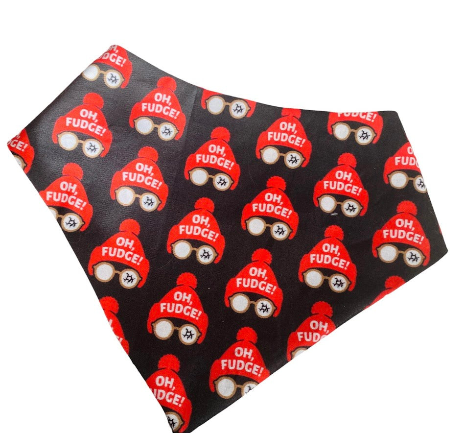 Ralphie from The Christmas Story Oh Fudge bandana,. Features Oh fudge front and red/black buffalo checkered back. Double sewn and double snapped for durability. Get some Ralphie glasses too!